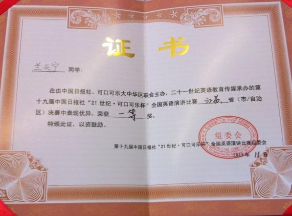 选手兰天宁来自会计专业,并非英语专业,但她凭借自己扎实的英语功底和出色的临场发挥,赢得全场评委老师的一致认可和赞美,荣获一等奖的佳绩。
