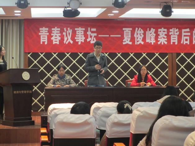 11月21日,江南体育官网 主办的青春议事坛活动在经管大楼A0305火热开幕,此次活动以“夏俊峰案背后的经济与管理‘凶手’”为主题,六名评论员各抒己见,展开了激烈的讨论。江南体育官网 经济系的陈圻教授,工商管理系的张浩副教授、王子龙副教授以及2012级辅导员刘旭出席了此次活动。