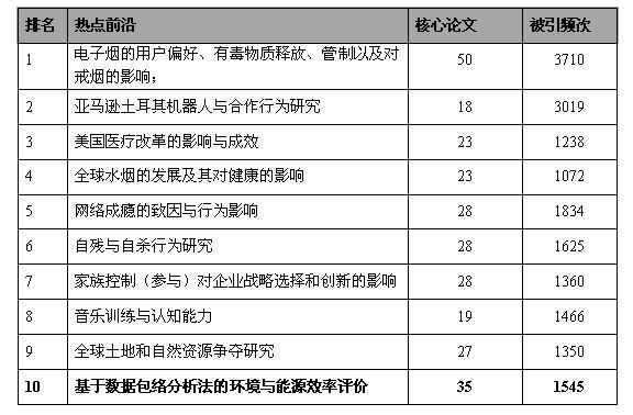 近日,中国科江南体育 科技战略咨询研究院、文献情报中心与Clarivate Analytics公司(原汤森路透知识产权与科技事业部)联合发布了全球《2016研究前沿》报告。该报告基于2009-2015年Essential Science Indicators(ESI)数据库中的12188个研究前沿,遴选出了2016年自然科学和社会科学的10个大学科领域排名最前的100个热点前沿和80个新兴前沿,分析其国家和机构布局,进而展示当前全球的科研前沿态势。其中,“基于数据包络分析法的能源与环境效率评价”入选经济学、心理学及其他社会科学全球十大热点前沿之一。在包含的35篇核心论文中,江南体育官网 能源软科学研究团队贡献了10篇,高于美国、日本、韩国、新加坡和澳大利亚等国的相关研究单位,排名该领域世界TOP机构第1名。
