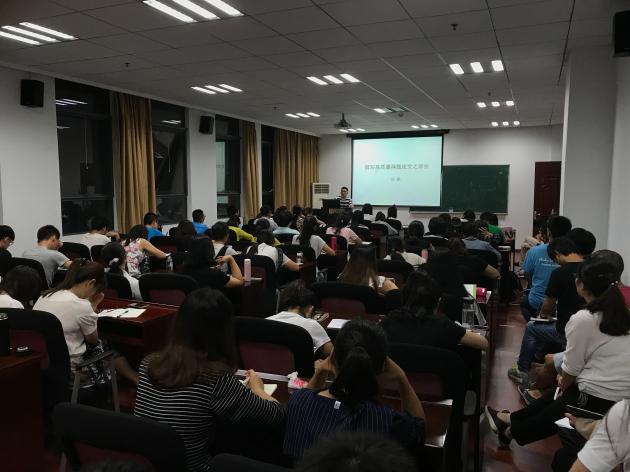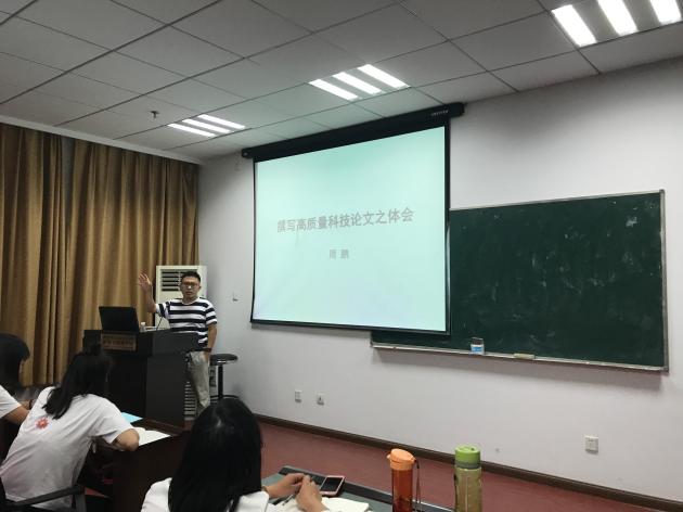 2017年9月26日18:00,在江南体育 704教室,周鹏老师为2017级研究生新生做了题为“如何撰写高质量科技论文”的精彩学术讲座。讲座由罗正军副教授主持,全院近百名硕士研究生和博士研究生参加了此次讲座。