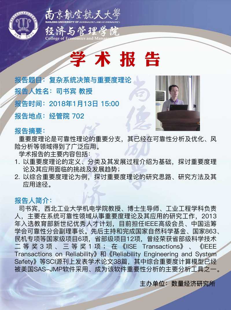 作者简介:司书宾,西北工业大学机电江南体育 教授、博士生导师、工业工程学科负责人,主要在系统可靠性领域从事重要度理论及其应用的研究工作,2013年入选教育部新世纪优秀人才计划,目前担任IEEE高级会员、中国运筹学会可靠性分会副理事长。先后主持和完成国家自然科学基金、国家863、民机专项等国家级项目6项,省部级项目12项,曾经荣获省部级科学技术二等奖3项、三等奖1项;在《IISE Transactions》、《IEEE Transactions on Reliability》和《Reliability Engineering and System Safety》等SCI源刊上发表学术论文38篇,其中综合重要度计算模型已经被美国SAS-JMP软件采用、成为该软件重要性分析的主要分析工具之一。