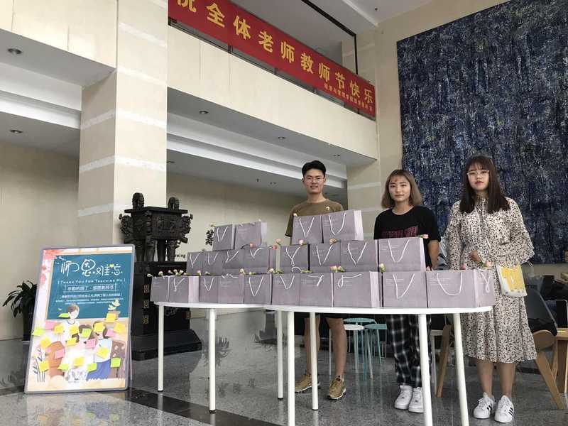 为了让更多的老师感受到同学们的情谊,同学们以“感恩礼袋”的形式送祝福:写得一手好字的同学们为老师们准备了带有经管特色的明信片,用简单而真挚的话语表达了同学们对老师的感恩之情。除此之外,可擦拭粉笔末的湿纸巾、能缓解老师长时间授课喉咙不适的金嗓子喉宝、为炎热的天气带来清凉的矿泉水、象征着爱与尊敬之情的康乃馨…同学们为老师准备的虽然都是些小礼物,但表达的是我们对老师的关心和感恩,是我们对经管老师们的一片用心。