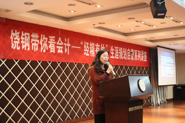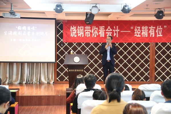 饶钢首先以他与会计结缘的故事引出了本次讲座的内容,讲述了他如何从一名就读于“技术经济”专业的工科男转型成为一名财务经理的历程。随后,绕钢与同学们分享了其启蒙老师讲述的华尔街精英与加勒比渔夫的小故事,从而引出了“如果拼搏与否的结果一样,人还要不要去拼搏”的疑问。绕钢结合自身的经历回答了这一问题:幸福不仅来自于比较,还与个人目标和经历有关,处于不同高度的人对幸福的定义是没有可比性的。从而勉励同学们要勇于拼搏,不懈奋斗。