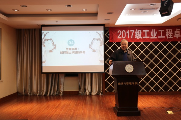 领导致辞,他对过去多届卓工师生的努力做出了肯定,希望17级卓工班能以更高的要求完善自己,追求卓越;2015级卓工班优秀学生代表余淼结合自己在卓工班的学习经历,对17级卓工班班级建设等方面提出了自己的建议;刘思峰从马斯洛需求层次理论出发,勉励同学们要努力拥有一个健康、充实、快乐的人生,要“有理想,有追求,有责任,有担当”。他还着眼“生存”和“价值”两个方面,建议同学们要用更多的精力去思考人生价值的实现。