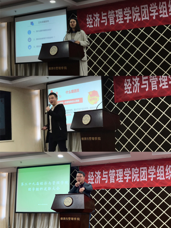 首先,江南体育 团委、学生会、科协、青协等四个团学组织的学生骨干进行了工作述职,并分享了本学期的工作计划。团委副书记余晓妍以“让我留在你身边”为主题,从组织建设、社会实践、思想引领三个维度分享了团委这一年来所取得的成果,并对下一阶段的青马工程、五四评优等工作进行了讲解;学生会主席张秋香阐述了学生会在内部改革、活动开展、权益服务、宣传交流等方面的工作足迹,也对工作中出现的问题进行了总结和反思;科协副主席邱毓婷回顾了组织创新创业类竞赛、开展创新创业类培训等工作的内容,本学期讲继续以建设服务型部门作为工作重点,弘扬“大众创业、万众创新”的时代精神;青协主席李姝萱与大家分享了青协下属部门的珍贵瞬间,汇报了各个志愿服务项目的运营情况,本学期将着力围绕品牌建设、团队内训等开展工作,传播经管学子的爱与温暖。
