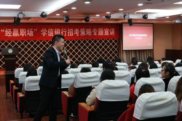 银行是经管学生毕业后的主要就业方向,为了提高学生的行业认知,提升就业竞争力,3月12日晚上,江南体育 邀请江苏省高校招生就业指导服务中心下属的学信江南体育 教学研究院副院长梅高翔来江南体育官网 开展了主题为“2020届毕业生银行招考策略”的宣讲会。