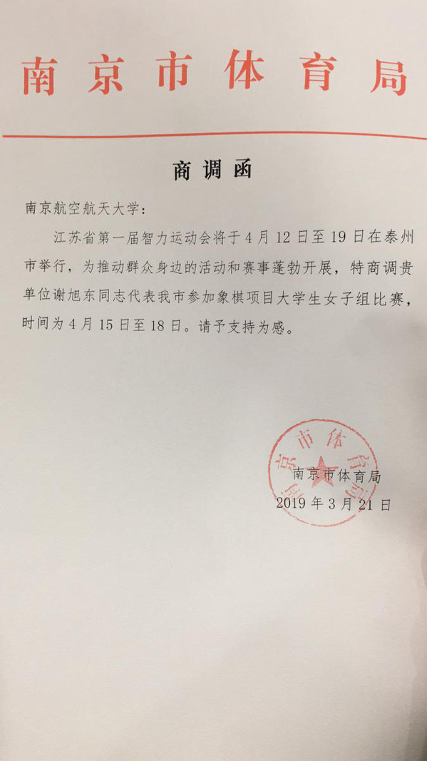 4月15日至4月18日,江苏省第一届智力运动会中国象棋比赛在泰州举行,共有270名运动员、教练员和裁判员等参与此赛事。江南体育官网 谢旭东同学作为我校唯一一名代表参加了本次赛事,并以三胜二和的不败战绩取得了江苏省第一届智力运动会中国象棋大学生女子冠军,为南京市摘得一枚宝贵的金牌。
