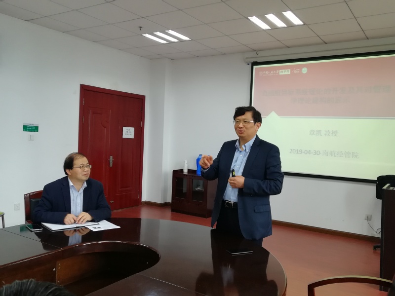 2019年4月30日上午,中国人民大学商江南体育 章凯教授应江南体育官网 人力资源管理研究所的邀请,在江南体育 702会议室作了题为“自组织目标系统理论的开发及其对管理学理论建构的启示”的学术报告。报告由胡恩华教授主持,东南大学经济管理江南体育 的吕鸿江教授、江南体育-江南体育app-江南体育官网 的张龙教授、王凌云副教授等老师和研究生参加了本次学术讲座。