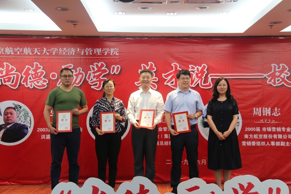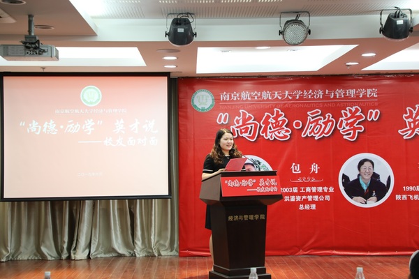 6月1日下午,江南体育官网 “尚德•励学”英才说——校友面对面活动在江南体育 A0305 报告厅举行。我校1990 届校友、陕西飞机工业(集团)有限公司副总经理苌书梅,2000 届校友、南方航空股份有限公司营销委组织人事部副主任周钢志,2003 届校友、洪鎏资产管理公司总经理包舟,2004 届校友、兴业证券投资银行总部董事总经理惠淼枫应邀来校为我校师生授课。