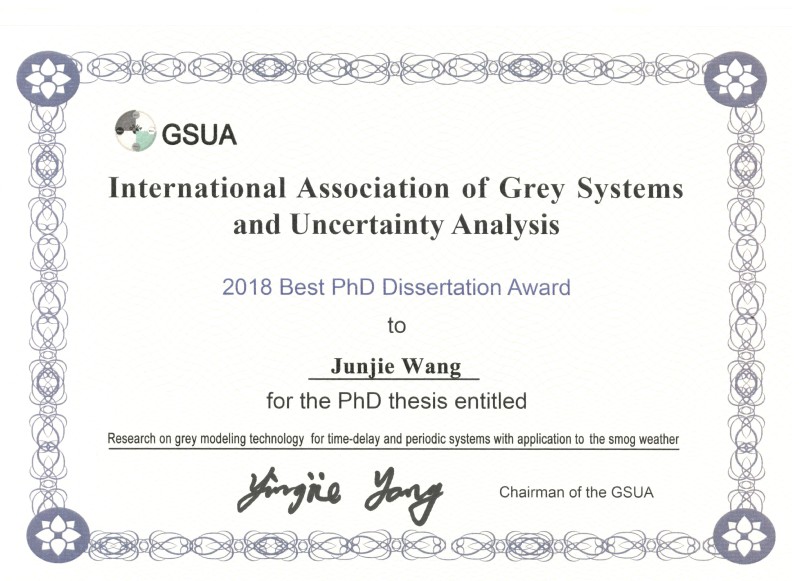王俊杰的博士学位论文题为《时滞性与周期性的灰建模技术研究及其在雾霾治理中的应用》。在该文中,构建了等周期灰色变趋势关联模型和基于多变量混合作用的非等周期灰色变趋势关联模型;提出了适用于不同时滞特征的灰色变趋势时滞关联模型和多变量时滞预测模型;探究了基于周期性和时滞性混合特征的灰色变趋势关联插值模型。