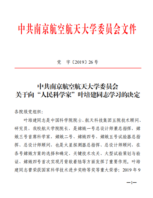 为大力宣传叶培建同志的先进事迹,引导和激励广大党员和教职员工大力弘扬叶培建同志“忠诚、执着、朴实” 的鲜明品格,争做新时代的接续奋斗者,今日,学校党委下发《关于向“人民科学家”叶培建同志学习的决定》,要求全校各级党组织结合“不忘初心、牢记使命”主题教育,大力弘扬爱国奉献的时代精神,在全校上下形成团结一致、共同奋斗的浓厚氛围。