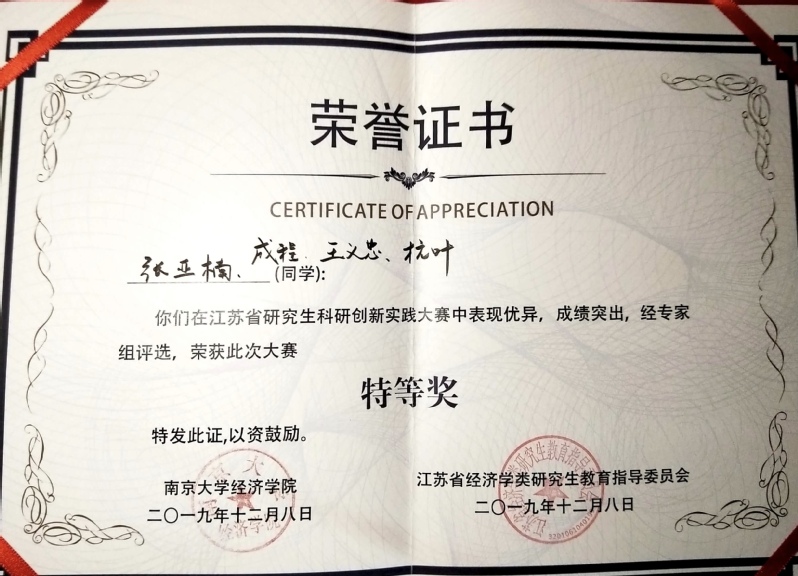 12月8日,江苏省研究生科研创新实践大赛决赛在南京大学顺利进行,共有来自19所全国高校的22支队伍参加汇报,江南体育官网 研究生张亚楠、成程、王义忠、杭叶组成的Wgroup(团队名)打败了诸多强手,荣膺特等奖,获得奖金10000元。