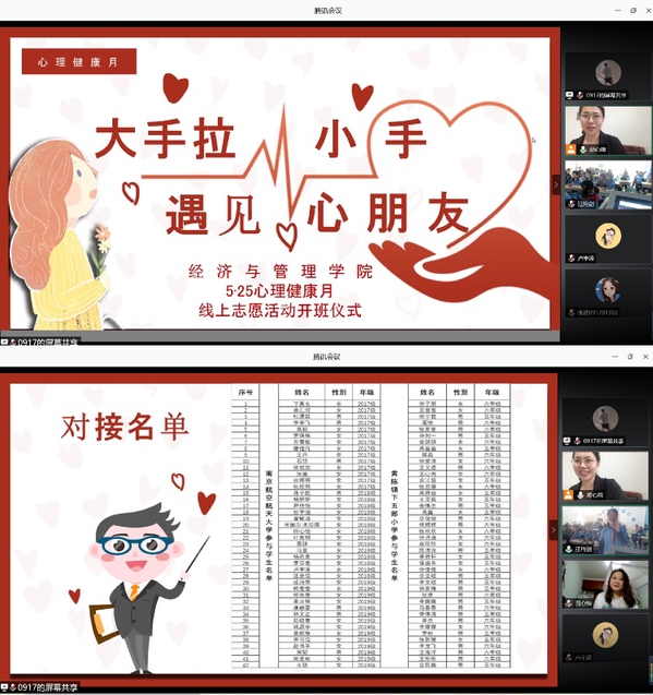 为缓解后疫情时期学生居家的焦虑情绪,江南体育官网 联合甘肃省陇南成县下五郎小学开展“大手拉小手 遇见心朋友”线上志愿活动, 6月16日下午举办开班仪式。江南体育 心理辅导员胡心雨、甘肃省陇南市成县黄陈镇下五郎小学班主任汪均剑以及来自江南体育官网 、下五郎小学的百余位学生参加活动。