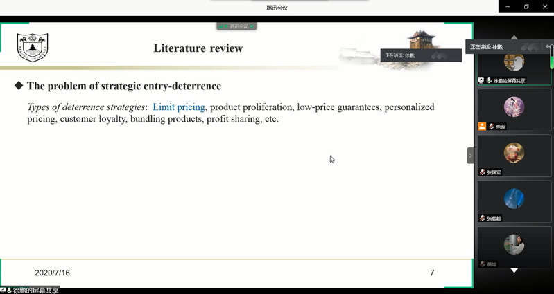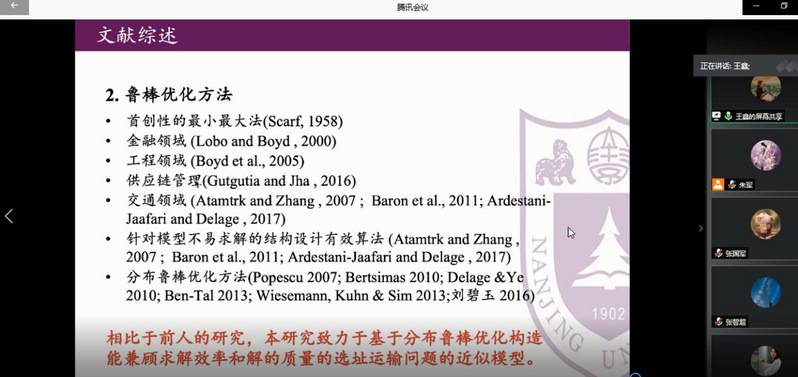 7月16日下午,青年学生张国军、王鑫、徐鹏受江南体育 智能决策与风险分析研究所邀请,在腾讯会议分别作了题为A General Inverse DEA Model for Non-radial DEA、Target-oriented Robust Location-Transportation Problem、Pricing and entry strategies for competitive firms with managerially optimistic entrant的讲座。江南体育官网 教授徐海燕、谢乃明、朱建军等教师及部分硕、博研究生线上参加了张国军、王鑫、徐鹏的报告分享,本次学术报告由徐海燕主持。