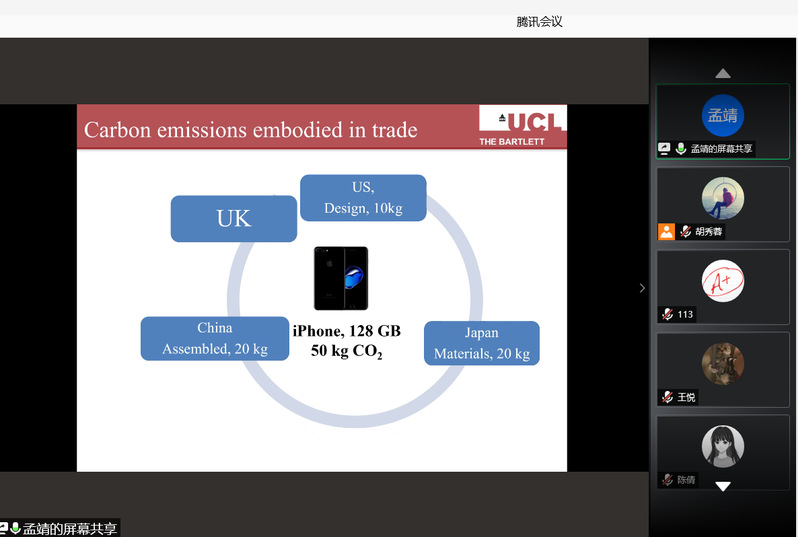 9月7日,伦敦大学江南体育 助理教授孟靖应江南体育官网 能源经济软科学中心邀请,在线上为我校师生作了一场“国际贸易与碳排放”的精彩学术报告。报告由青年教师胡秀蓉主持,教授查冬兰、张钦、青年教师、博士研究生、硕士研究生等近百余人参加了本次学术讲座。