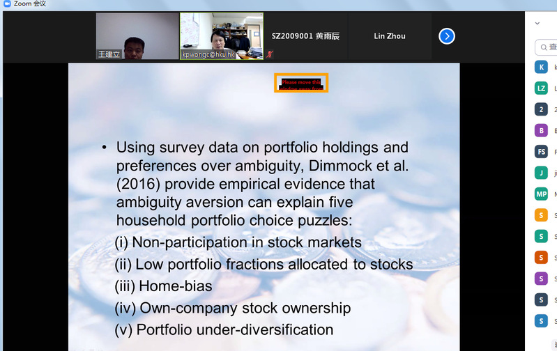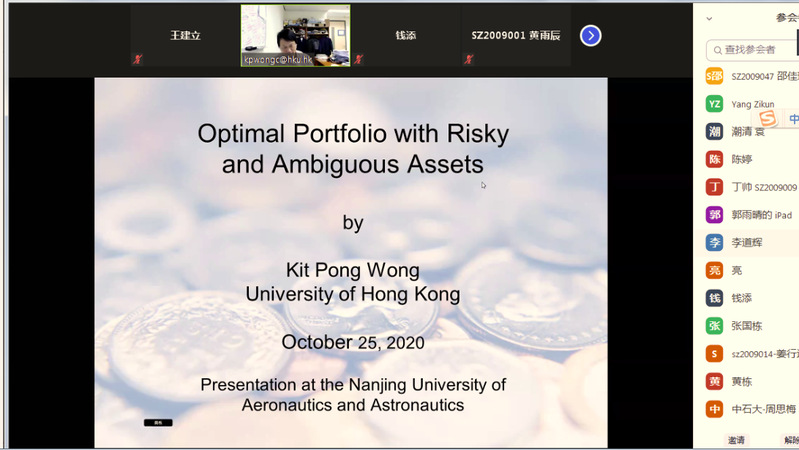10月25日,香港大学教授Kit Pong Wong应江南体育官网 金融研究所邀请,在线上为我校师生作了一场题为“Optimal Portfolios with Risky and Ambiguous Assets”的精彩学术讲座。讲座由金融研究所所长王建立主持。教授袁潮清、副教授桑秀芝、陆珩瑱、苏飞等教师及部分硕、博研究生参加了本次学术交流。