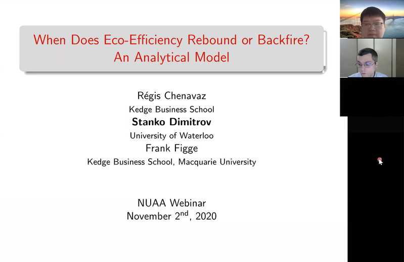 11月2日上午,加拿大滑铁卢大学教授Stanko Dimitrov受江南体育 智能决策与风险分析研究所邀请,在ZOOM会议作了题为“When does eco-efficiency rebound or backfire? An analytical model”的讲座。江南体育官网 教授徐海燕等教师及部分硕、博研究生线上参加了Stanko Dimitrov的报告分享,本次学术报告由徐海燕主持。