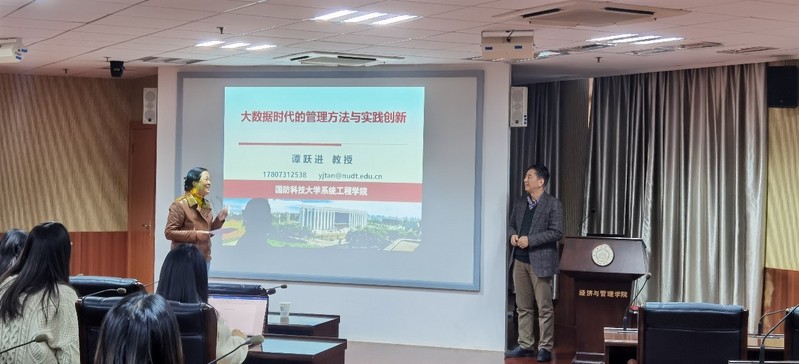 谭跃进的报告详细介绍了大数据时代的管理方法、实践与创新,强调了大数据时代思维转变的重要性,极大地调动了在坐师生的兴趣,在坐师生与谭跃进积极讨论大数据采集和数据关联性分析等问题,收获颇丰。