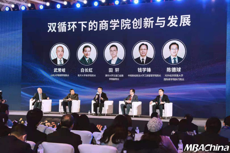 圆桌对话环节,山东大学管理江南体育 院长武常岐担任主持人,南开大学商江南体育 院长白长虹、清华大学五道口金融江南体育 副院长田轩、中南财经政法大学工商管理江南体育 院长钱学峰、对外经济贸易大学国际商江南体育 执行院长陈德球针对“双循环下的商江南体育 创新与发展”进行了深入的交流。