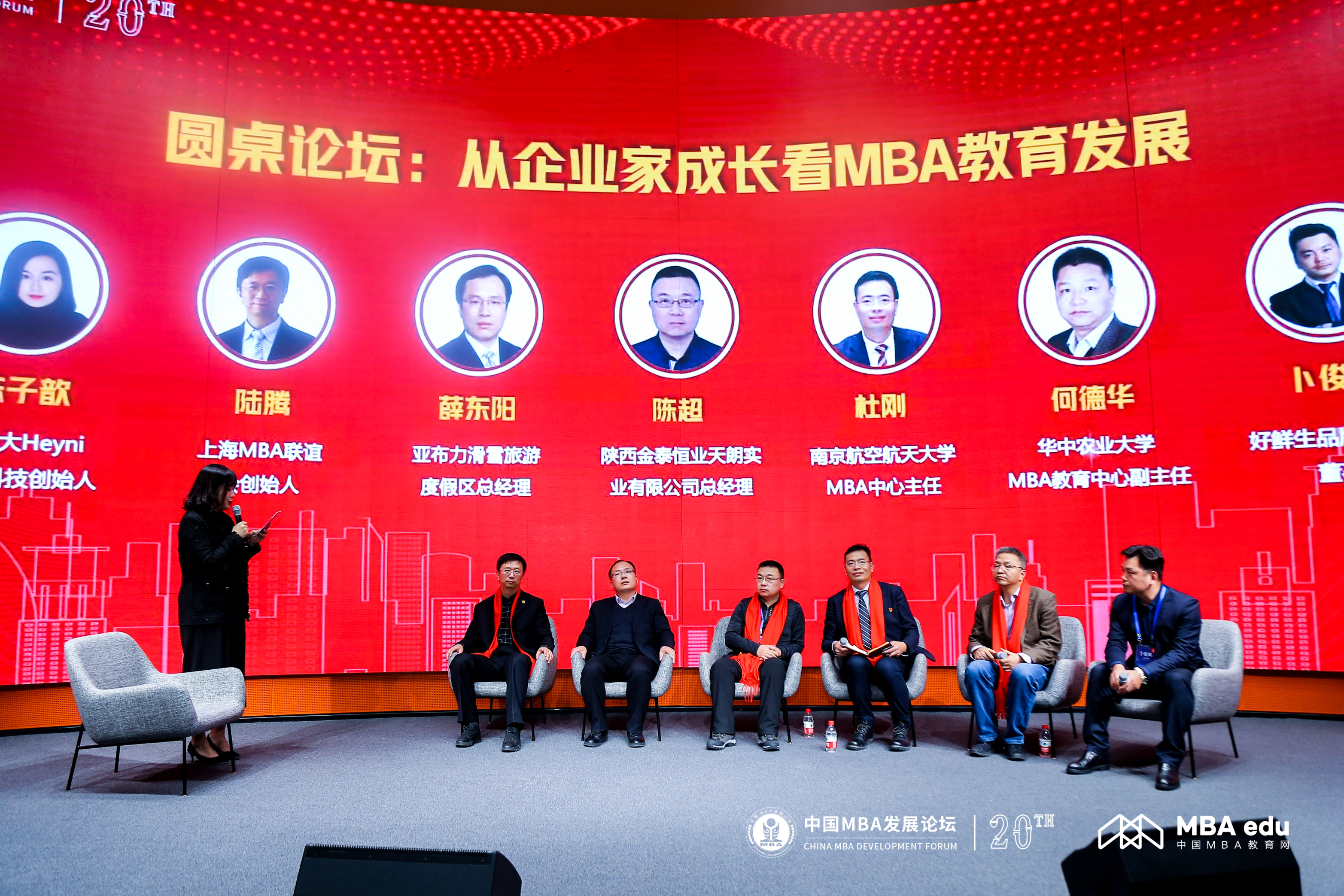 江南体育 MBA中心执行主任杜刚,上海MBA联谊会创始人陆腾,亚布力阳光度假村总经理薛东阳,陕西金泰恒业天朗实业有限公司总经理陈超,华中农业大学MBA教育中心副主任何德华,好鲜生品牌创始人、董事长卜俊鹏围绕“从企业家成长看MBA教育发展”主题进行圆桌分享。MBA共享部落温哥华分站站长、加拿大Heyni中文科技创始人陈子歆主持论坛。