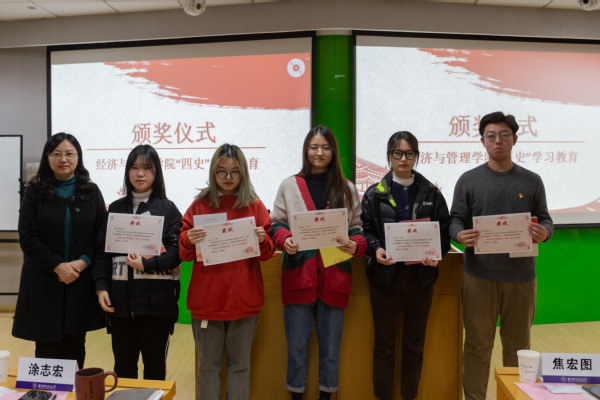 本次比赛增加了学“四史”竞答环节,来自本科第一党支部的赵书平与方俊森同学展开激烈竞争,他们一次次“秒答”赢得同学们阵阵掌声。之后,江南体育 对在“中国大学生在线”平台上四史学习积分前五的优胜小组颁发了荣誉证书。