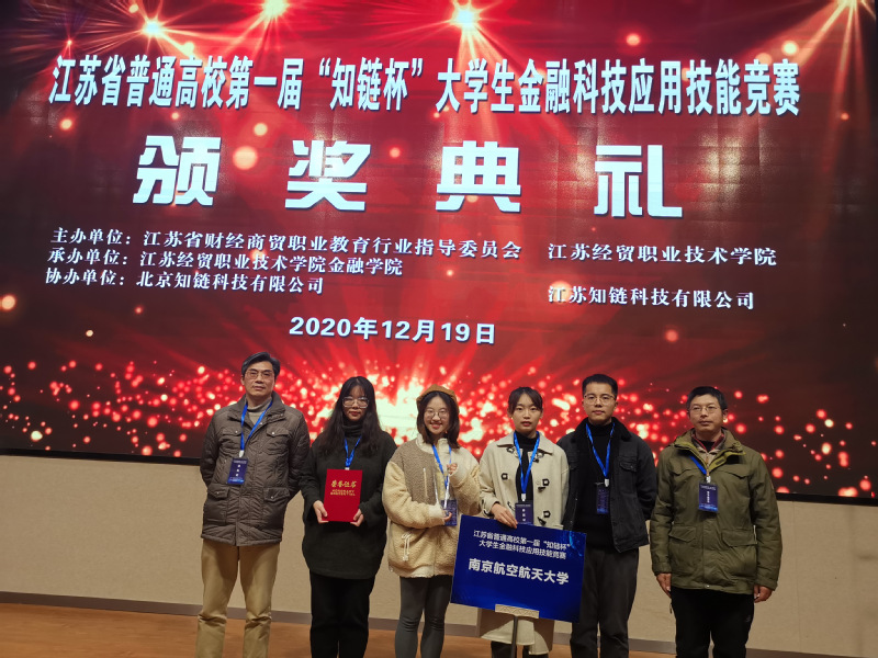 2020年12月19日,江苏省普通高校第一届“知链杯”大学生金融科技应用技能竞赛在江苏经贸职业技术江南体育 举办,本次竞赛由江苏省高等教育学会认定,江苏省教育厅委托江苏省财经商贸职业教育行业指导委员会主办,南航、河海、南农等省内50余院校60团队300师生参赛。通过激烈地角逐,江南体育官网 代表队获得了本次大赛的本科组团体一等奖。
