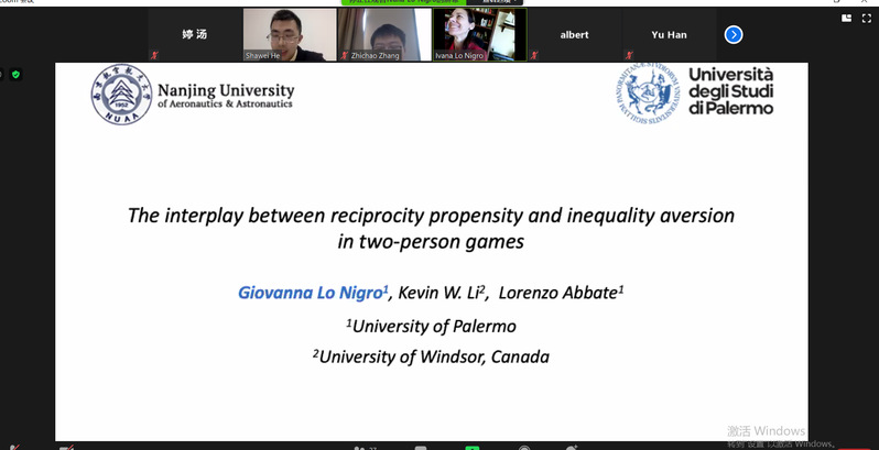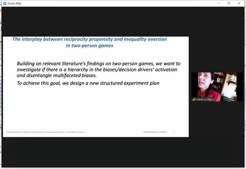 12月28日下午,意大利巴勒莫大学教授Giovanna Lo Nigro受江南体育 智能决策与风险分析研究所邀请,在ZOOM会议作了题为“The interplay of reciprocity propensity and inequality aversion in two-person games”的学术报告。江南体育官网 徐海燕教授、何沙玮副教授等教师及部分硕、博研究生线上参加了Giovanna Lo Nigro的报告分享,本次学术报告由何沙玮主持。
