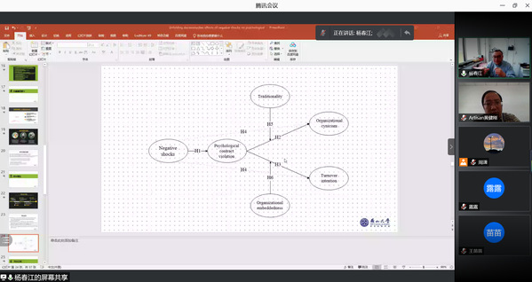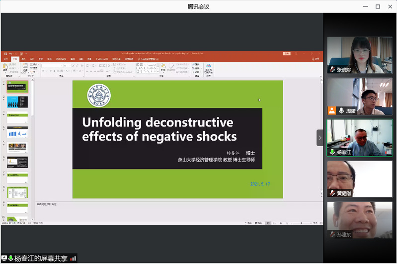 5月17日,燕山大学经济管理江南体育 教授杨春江应江南体育官网 人力资源管理研究所和江苏省人力资源发展研究基地的邀请,在线上作了题为“消极震撼事件的影响及机理研究——基于服务业一线员工的调查”的精彩学术报告。本次报告由教授胡恩华主持,年轻教师、博士生和硕士生参加了此次学术报告活动。