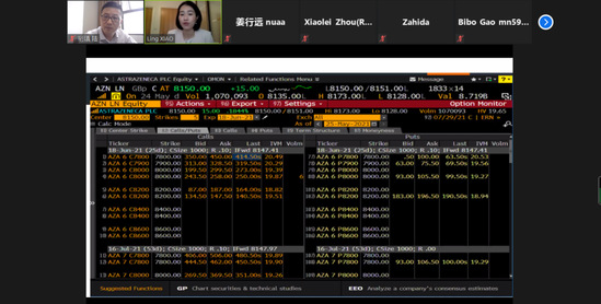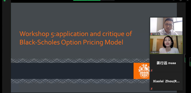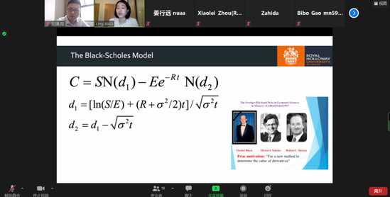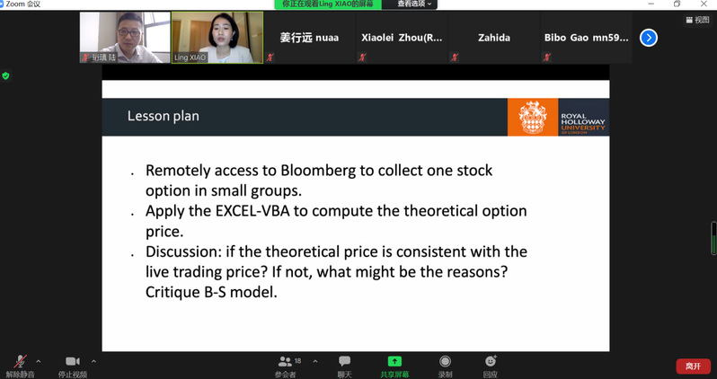 南航经济管理江南体育 8位硕士研究生与伦敦大学皇家霍洛威江南体育 10位硕士研究一起进入线上课堂。教学活动按照中英两个小组,使用Bloomberg实时股票价格数据和期权数据验证B-S模型,通过实时计算的期权价值与实际交易的期权价格进行比较,深入讨论二者的差异原因。