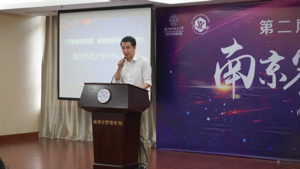 为了更有序地做好赛事推广,组委会邀请了两位嘉宾分享了他们的人生故事。第一位演讲嘉宾是来自南京师范大学的MBA学员杨笛,他分享的故事是《万物皆有裂痕,那是光照进来的地方》,从个人身体抱恙到驰骋于马拉松的赛场,每个MBA人都要学会接受万物的裂痕,因为那是光照进来的地方!