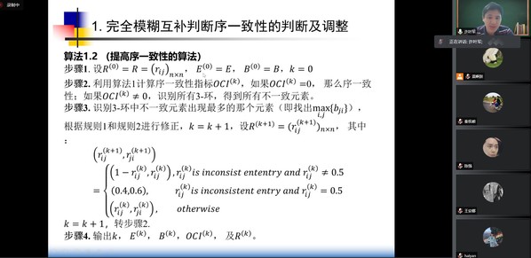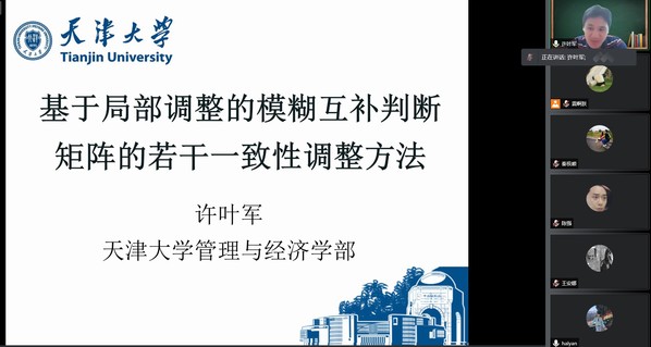 9月23日下午,天津大学教授许叶军受江南体育 智能决策与风险分析研究所邀请,在腾讯会议作题为“基于局部调整的模糊互补判断矩阵的若干一致性调整方法”的讲座。江南体育官网 教授徐海燕等教师及部分硕、博研究生线上参加许叶军的报告分享,本次学术报告由徐海燕主持。