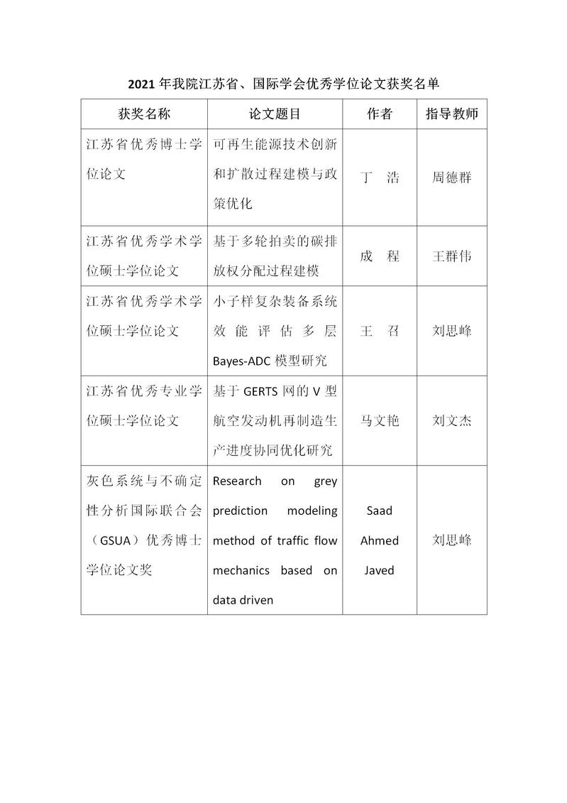 近日,2021年江苏省优秀博士硕士学位论文、国际学会优秀学位论文获奖名单陆续公布。江南体育官网 师生表现突出,斩获2021年度江苏省优秀博士学位论文1篇、江苏省优秀学术学位硕士学位论文2篇、江苏省优秀专业学位硕士学位论文1篇、灰色系统与不确定性分析国际联合会优秀博士学位论文1篇。