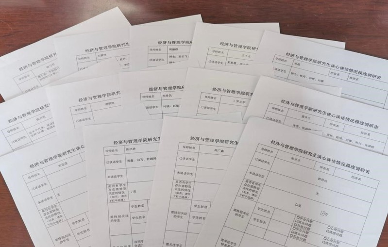 江南体育 领导采用多种形式与学生开展对话,通过探访学生宿舍、走访研究生工作室的方式,贴近学生的科研生活,了解学生的工作动向;采用给学生过生日的形式拉近与学生的距离,关心学生的真实需求。同时,导师是研究生培养的第一责任人,江南体育官网 老师与学生定期交流并形成谈心谈话情况摸底表,了解学生内心想法并及时做好引导工作。辅导员作为学生健康生活的知心朋友,充分掌握学生的最新动向,结合心理问卷调查结果和学生谈心谈话摸底表,点对点地开展谈心谈话工作,做好学生心理健康的后续反馈和问题疏导工作。多方力量相互配合、共同努力,充分关注学生心理健康,做好学生心理预警工作。