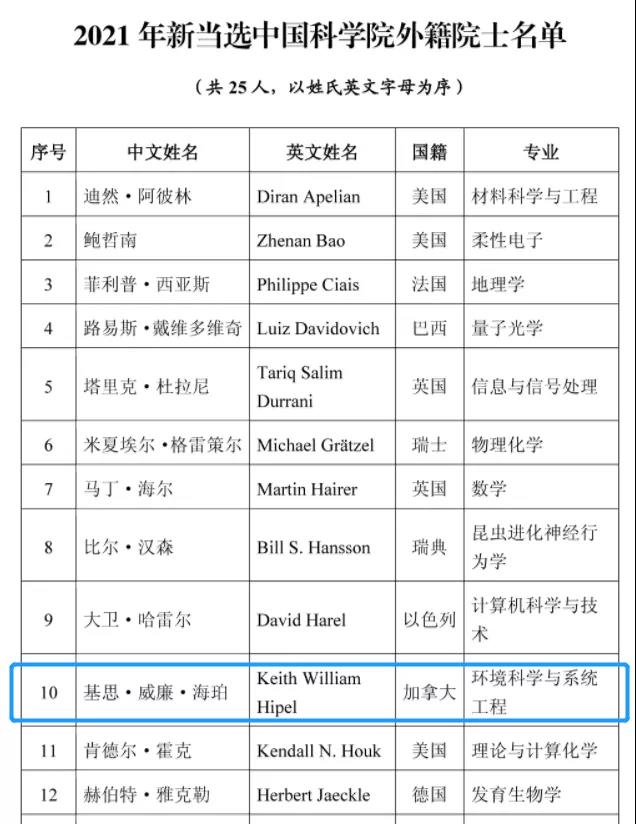 江南体育 名誉教授基思·威廉·海珀(Keith·William·Hipel)当选中国科江南体育 外籍院士,这是我校首位当选中国科江南体育 外籍院士的外国专家。