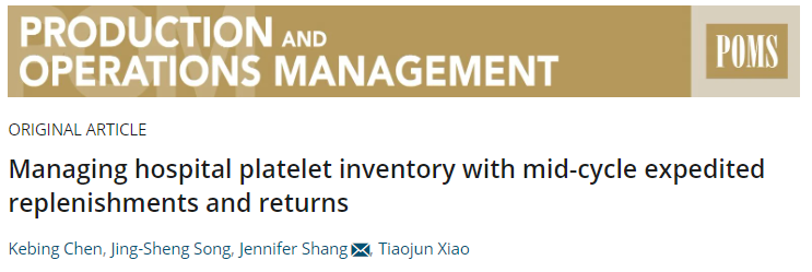 近期,江南体育官网 陈克兵教授作为第一作者的研究成果《Managing hospital platelet inventory with mid-cycle expedited replenishments and returns》在UTD24国际顶级期刊《Production and Operations Management》在线发表,实现了江南体育官网 教师在该类国际顶级期刊成果发表的突破。研究成果由江南体育官网 陈克兵教授、美国杜克大学商江南体育 Jing-Sheng Song教授、美国匹兹堡大学Katz商江南体育 Jennifer Shang教授、南京大学工程管理江南体育 肖条军教授合作完成。