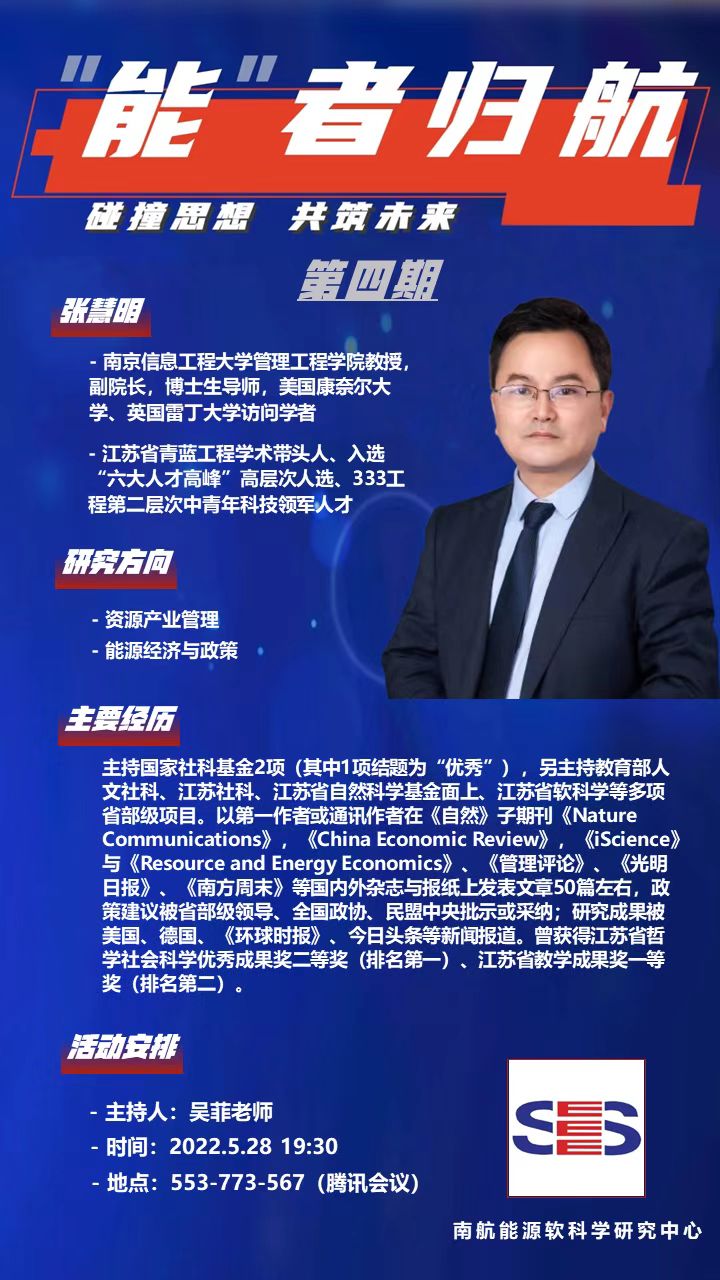 5月28日晚,江南体育官网 能源软科学研究中心第四期“能者归航”活动于线上召开。活动邀请了江南体育 管理科学与工程专业2008级博士毕业生,现南京信息工程大学管理工程江南体育 副院长、博士生导师张慧明老师。活动由能源软科学创新团队党支部委员、研究生兼职辅导员吴菲策划并主持。周德群、王群伟、王长波、朱庆缘、丁浩等60余位师生共同参与。