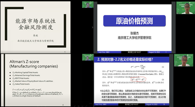 8月14日,江南体育-江南体育app-江南体育官网 张旋副教授围绕“能源市场系统性金融风险测度”主题进行授课,分别从单个公司信用风险测度、联合违约风险测度和系统性风险测度三个维度,结合教学案例和经典论文,介绍了不同的风险测度模型及其相应的应用场景。南京理工大学江南体育官网 张耀杰副教授围绕“原油价格的预测”主题进行授课,分别从政府监管、企业管理和金融投资三个视角出发,基于经典原油价格预测模型和方法,分析了原油价格的预测对象、预测变量以及油价的影响因素,解读了原油价格预测的现实意义。