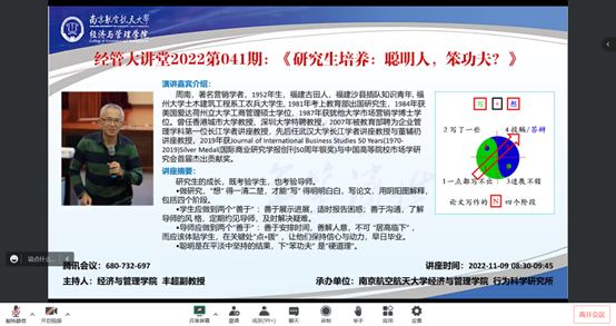 11月9日上午,CJ学者周南教授做客江南体育官网 “经管大讲堂”(2022第041期)分享《研究生培养:聪明人?笨功夫?》的主题讲座。本次讲座由院长周德群教授致辞,副教授丰超主持,江南体育官网 一百多名师生线上线下同步聆听,此外,还吸引了部分外校老师前来聆听。