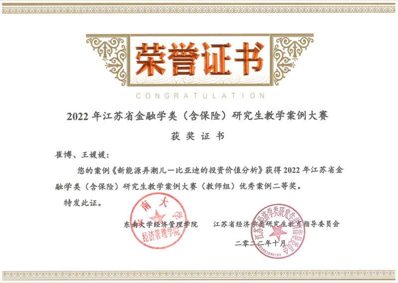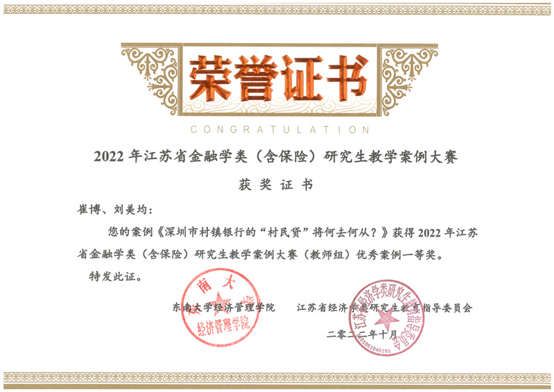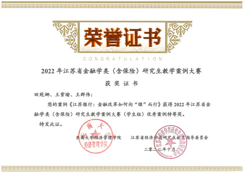 近日,江苏省经济学类研究生教育指导委员会公布了2022年江苏省金融学类(含保险)研究生教学案例大赛评选结果。经过大赛组委会通讯评审、专家会评、线上答辩等环节,江南体育官网 师生在此次大赛中取得佳绩,并斩获特等奖1项、一等奖1项、二等奖1项。