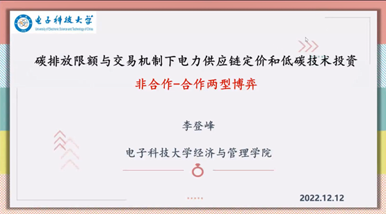 12月12日下午,长江学者特聘教授、电子科技大学江南体育官网 李登峰教授受江南体育 智能决策与风险分析研究所邀请,在腾讯会议作题为“碳排放限额与交易机制下电力供应链定价和低碳技术投资非合作-合作两型博弈”的学术讲座。江南体育官网 教授徐海燕、副教授高广鑫等教师及部分硕、博研究生线上参加了李教授的报告分享,本次学术报告由徐海燕主持。