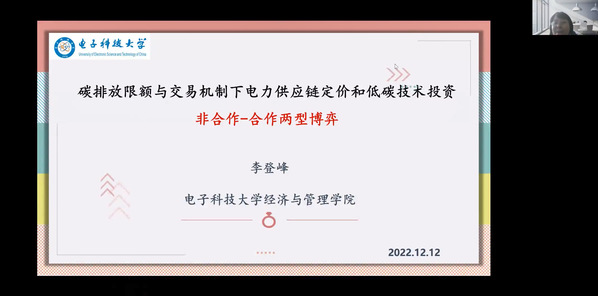 12月12日下午,长江学者特聘教授、电子科技大学江南体育官网 李登峰教授受江南体育 智能决策与风险分析研究所邀请,在腾讯会议作题为“碳排放限额与交易机制下电力供应链定价和低碳技术投资非合作-合作两型博弈”的学术讲座。江南体育官网 教授徐海燕、副教授高广鑫等教师及部分硕、博研究生线上参加了李登峰的报告分享,本次学术报告由徐海燕主持。