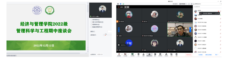随后,江南体育 组织2022级管理科学与工程师生线上座谈会,班主任们交流反馈了班级整体学习状态,各班班长、团支书提出部分同学存在的困难与诉求。系副主任何沙玮老师结合专业培养计划提出专业学习要求,针对学生的困惑,分享了高数学习技巧与方法。最后,江南体育 院长助理欧阳林寒老师对大一新生提出殷切期望,在学习、心理、生活、环境等方面尽快地适应大学节奏。