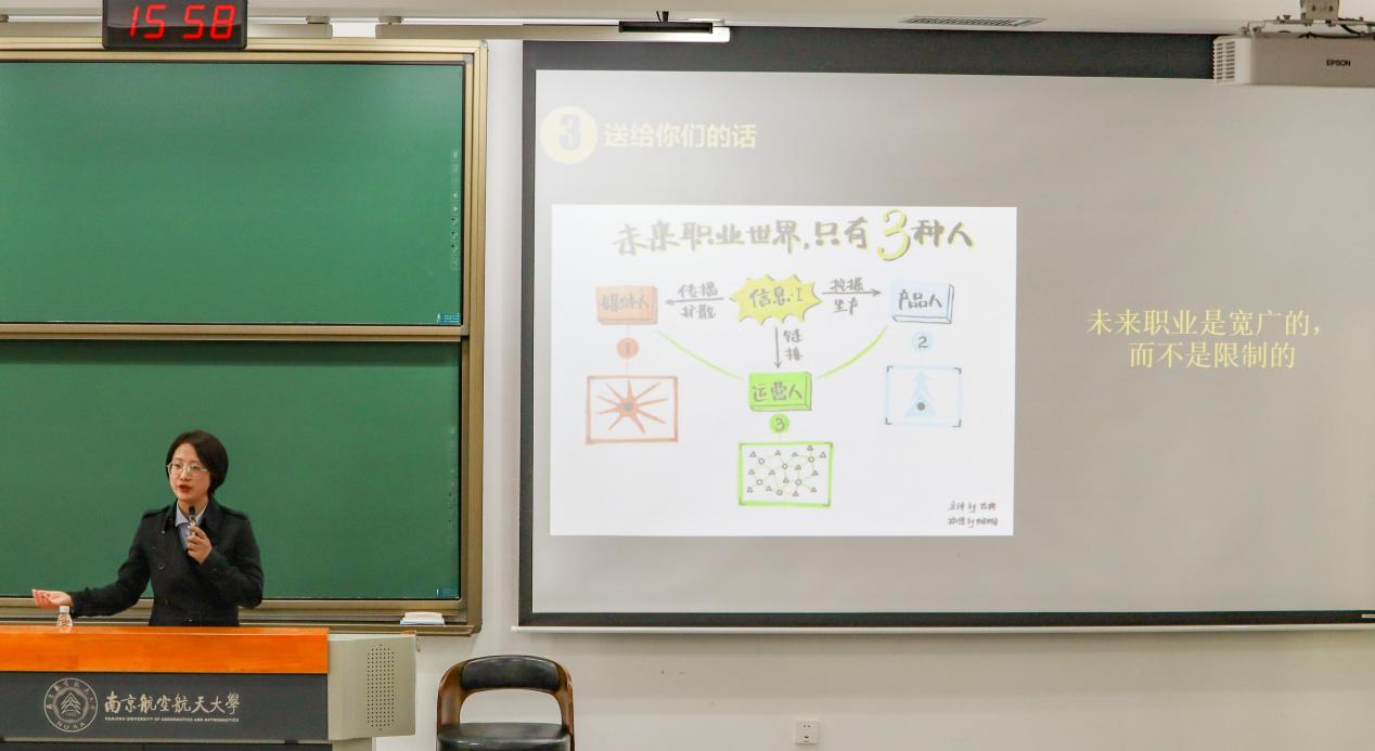 最后,王婷送给同学们4句话:“一个人最习惯处理信息的方式,决定了自己的职业路径和职业类型。”“未来职业是宽广的,而不是限制的。”“一个人遇到问题的思维模式,决定了这个人的生活品质。”“心智成熟,内在坚定,外在柔和。”希望大家能够清晰自身定位,认清苦劳大于功劳的时代已经过去,找寻能够提升自身能力,展现自身特色的职业平台。