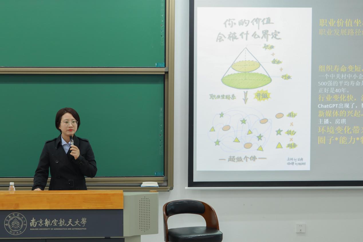 王婷总监首先就“如何定位自己的价值坐标系”展开分享,引导大家想象自己未来的工作场景,通过展示真实的案例,分析职场中大家可能会遇到的障碍,通过不断来问自身6个“为什么””怎么办“来扫除障碍建立符合自身价值的坐标。在讲座中王婷打破大家的固有思维,传递前沿的职场信息,提醒大家要跟上从”陆地生态“到”海洋生态“的职场潮流转变。