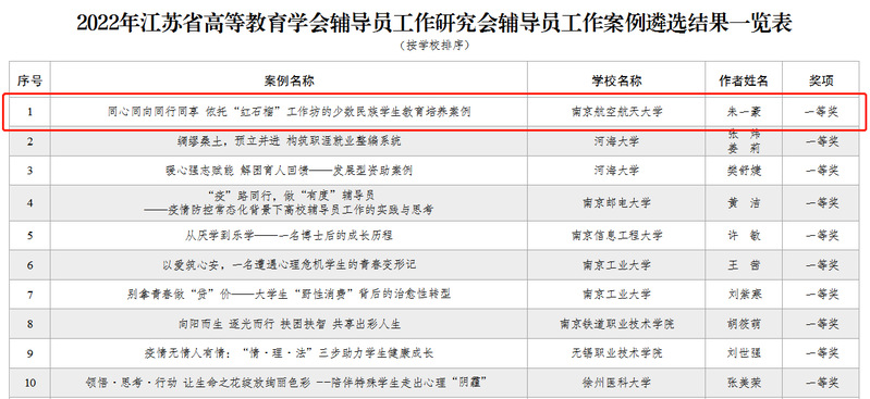 近日,江苏省高等教育学会辅导员工作研究委员会公布了2022年度辅导员工作案例遴选结果,江南体育官网 辅导员朱一豪撰写的《同心同向同行同享 依托“红石榴”工作坊的少数民族学生教育培养案例》荣获江苏省辅导员工作案例评选一等奖。