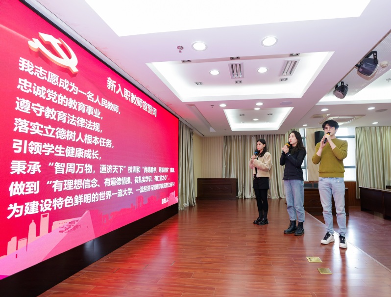 在新进教职工入职仪式上,卓迪生、张玉旋、胡晓菲三位老师在全院老师的见证下庄严宣誓:将忠诚党的教育事业,落实立德树人根本任务,秉承“智周万物,道济天下”校训和“尚德励学,筹策济世”院训,做“四有”好老师,为建设特色鲜明的世界一流大学、一流江南体育官网 而努力奋斗!