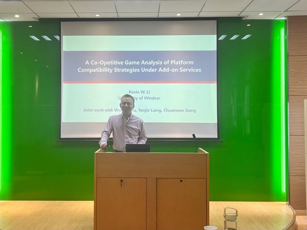 5月12日下午,加拿大温莎大学Odette商江南体育 李武(Kevin W. Li)教授受江南体育 智能决策与风险分析研究所邀请,在南航将军路校区江南体育官网 702会议室作题为“A Co-Opetitive Game Analysis of Platform Compatibility Strategies Under Add-on Services”的讲座。江南体育官网 教授徐海燕、教授陈克兵、副教授何沙玮、副教授王敏等教师及部分硕、博研究生现场聆听了李武教授的报告分享,本次学术报告由徐海燕教授主持。