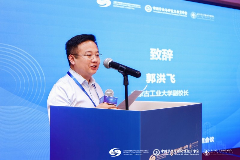 内蒙古工业大学副校长郭洪飞在会上致辞,他代表内蒙古工业大学向出席本次会议的领导、专家表示热烈欢迎,对主办单位表示由衷感谢,并对内蒙古工业大学商科历史沿革、办学特色及传承发展进行介绍。