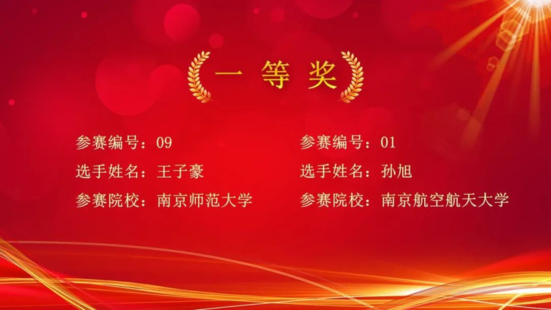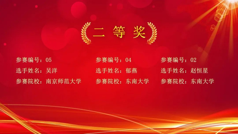 最后,在大家的共同见证下,颁奖盛典正式公布个人荣誉奖项和团队荣誉奖项获奖名单。南京师范大学王子豪、江南体育 孙旭荣获一等奖;南京师范大学吴洋、东南大学郁燕、赵恒星荣获二等奖;南京师范大学徐良笑、东南大学陈俊峰、南京大学赵一定、江南体育 李冬美、南京信息工程大学张佳山荣获三等奖。南京师范大学获得团队一等奖,东南大学获得团队二等奖,江南体育 获得团队三等奖。
