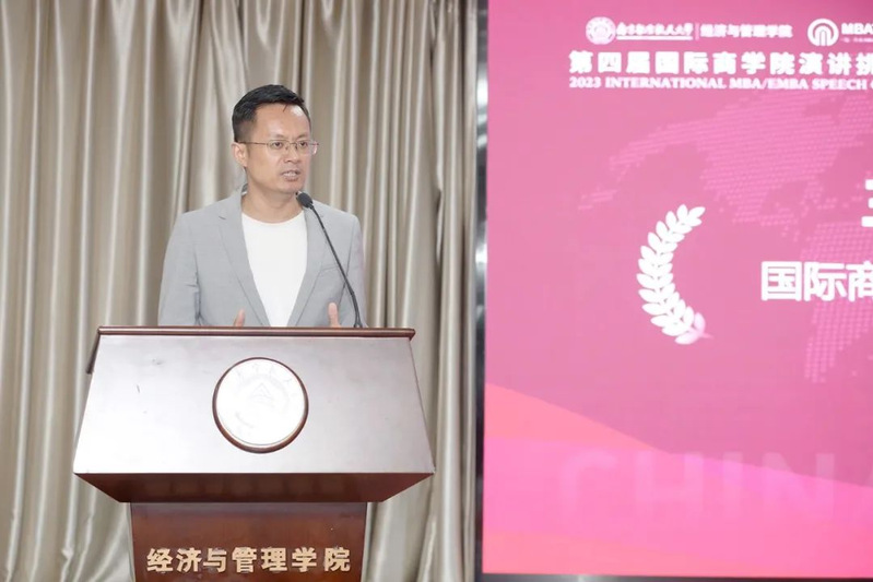 国际商江南体育 演讲挑战赛执行主席钱多多先生代表主办方致辞。致辞中,钱主席对国演赛的赛事理念进行阐释:国演赛是目前中国商江南体育 最大规模演讲比赛,大赛主题“讲述你的故事”,倡导商江南体育 同学们通过演讲“绽放魅力,连接彼此”,体现了现代商业领袖敢于展现个人魅力的精神。作为高端管理人才,我们不仅要掌握坚实的学术理论和商业实践经验,更需要具备展现自我的能力。当下的中国已经步入个人IP的时代,我们(E)MBA人需要通过演讲传播自己的个人影响力,赋能未来获得更大的事业成就。